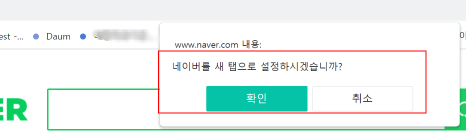 그리고 메뉴를 선택하게 되면 네이버를 새탭으로 설정하시겠습니까? 라는 부분을 통해서 확인을 눌러주시면 일단 네이버 바로가기 설정이 완료가 됩니다. 너무 쉬운데요. 또한가지 방법을 알려드릴께요.