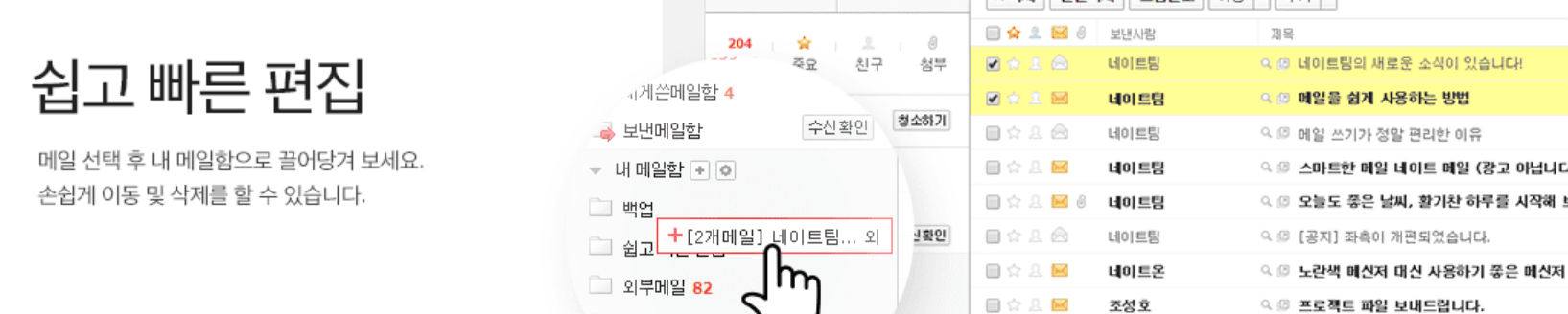 쉽고 빠른 편집 메일 선택 후 내 메일함으로 끌어당겨 보세요. 손쉽게 이동 및 삭제를 할 수 있습니다. 스마트한 우측 뷰 쓰기에서 자주 사용하는 메일주소를 저장할 수 있으며 편지함에서는 분
