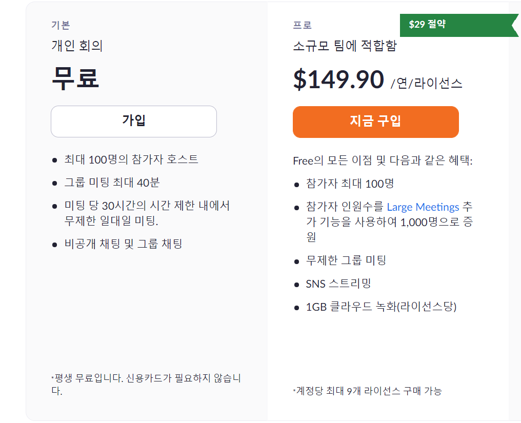 줌 클라우드 미팅 가격입니다. 개인이 쉽게 이용 하는 부분은 무료 입니다. 최대 100명까지 가능하며 단 40분 내 제한이 있습니다. 30시간 제한 으로 무제한 1:1 미팅은 가능합니다.