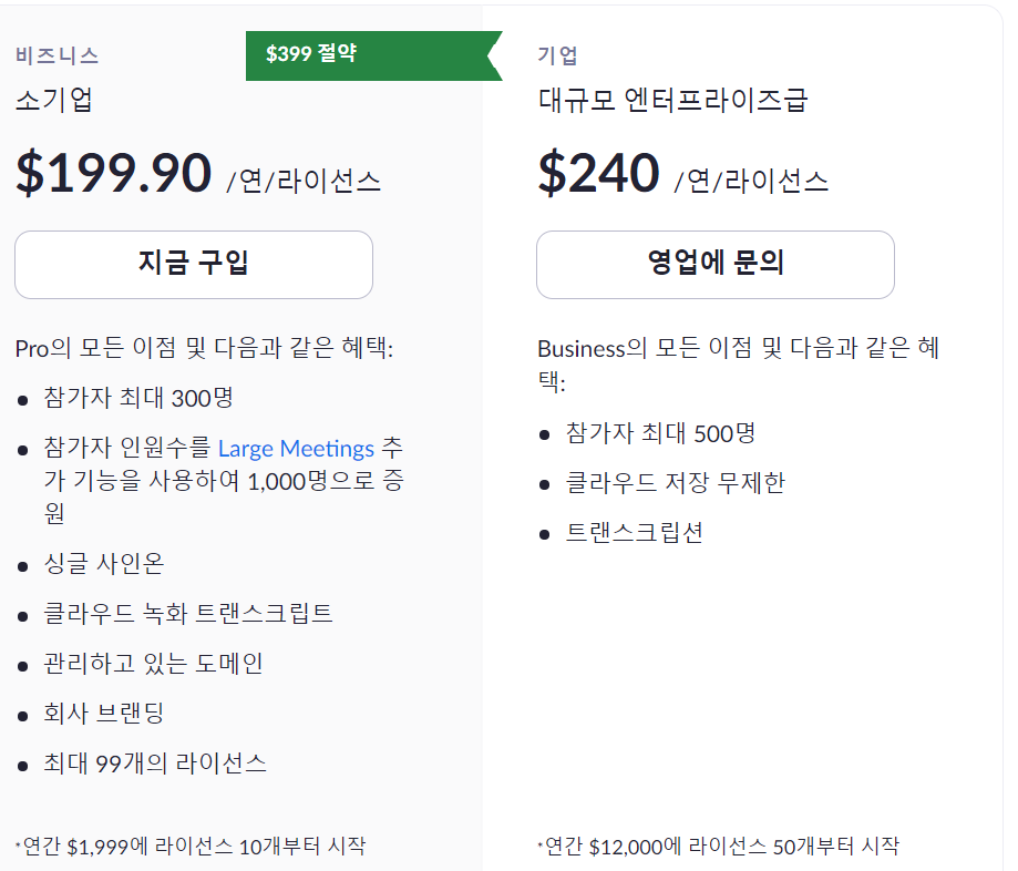프로는 월 15달라 정도로 최대100명 이며 무제한 그룹 미팅이 가능합니다. 나머지 비니지스는 참가자 제한이 300명 그리고 대규모 기업은 월 20달러로 최대 500명이 가능하죠.