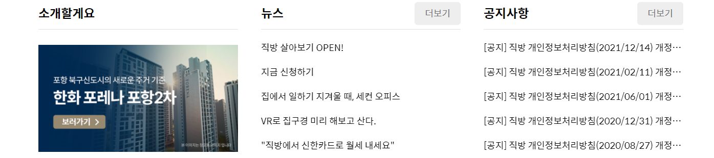 직방에서는 일단 소개 할래요 해서 각종 좋은 단지 소개 및 그리고 뉴스가 나오느네요. 다양한 뉴스 정보 그리고 공지사항을 보고 알수가 있습니다.