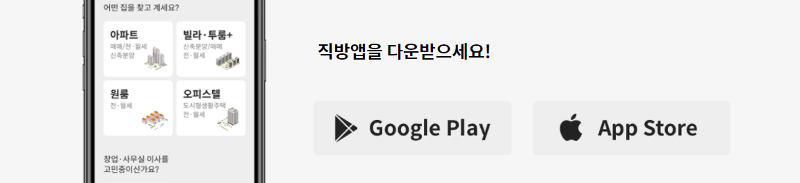 마지막으로 직방 앱을 다운받아서 이용할수가 있는데요. 구글 플레이나 애플 스토어 이용이 가능합니다.