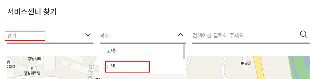 일단 올려 놓은 곳에서 일단 서비스센터 찾기 선택하시고 시/도 선택 하시고 구/군 선택하시면 됩니다.