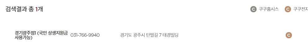 경기 광주점이 나오고 또한 국민 상생지원금 사용가능하다고 나오네요. 이런식으로 쿠쿠 서비스센터 위치를 찾으시면 됩니다.