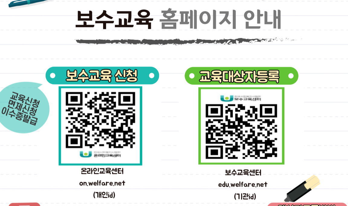 홈페이지 안내를 보시면 온라인교육센터가 있고 기관에서 하는 센터가 있습니다. 큐알코드를 이용해서 교육신청 및 면제 신청도 가능 합니다.