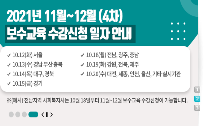 현재 보수교육 수강신청 날자 안내가 나오고 있습니다. 그리고 보통 보건계열은 자격증을 1년에 한번씩 이수를 해야 합니다.
